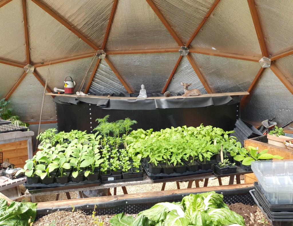 Au printemps 2019, une serre dôme de 7.9m de diamètre a été installée sur le lieu. Par sa forme ronde et le maintien d’une température hors gel, c’est le lieu idéal pour l’épanouissement des semis